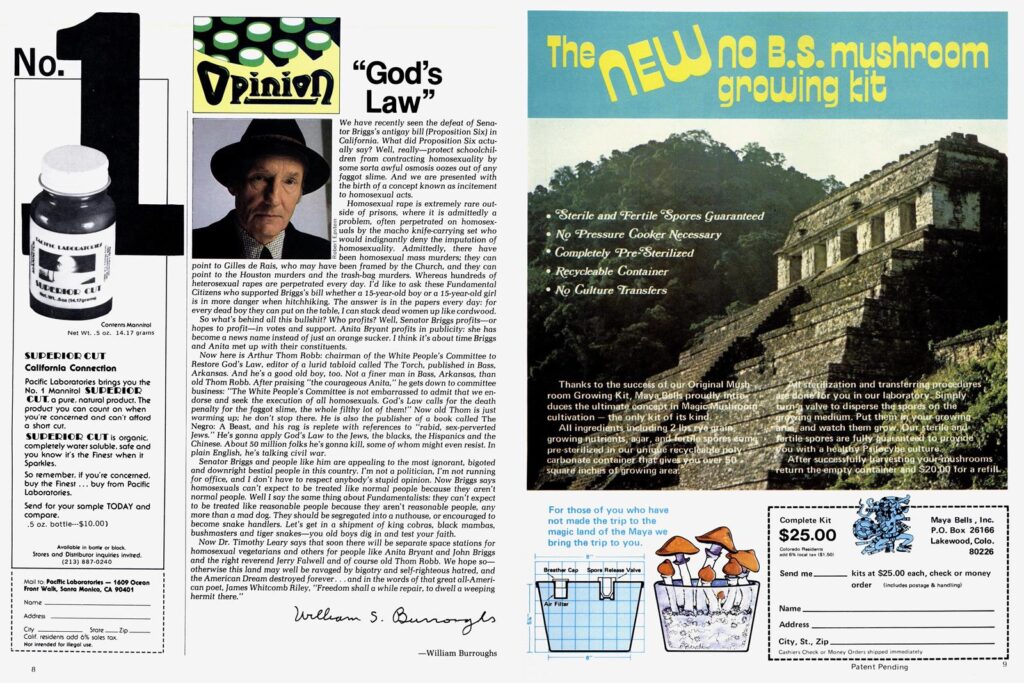 Original publication: July 1979. “God’s Law” By William Burroughs We have recently seen the defeat of Senator Briggs’s antigay bill (Proposition Six) in California. What did Proposition Six actually say? Well, really—protect schoolchildren from contracting homosexuality by some sorta awful osmosis oozes out of any fa**ot slime. And we are presented with the birth of…