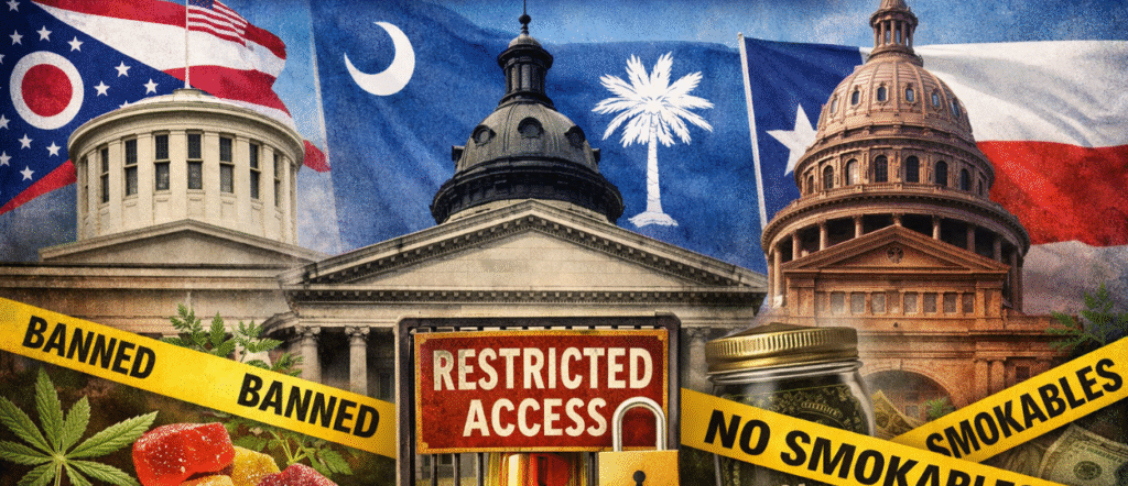 In Ohio, lawmakers let a ban on intoxicating hemp take hold after opponents failed to qualify a referendum for the ballot. In South Carolina, senators decided not to ban hemp THC outright, but to shove it into a much tighter retail box. And in Texas, regulators are about to take aim at one of the market’s hottest categories (smokable hemp and THCA flower) while leaving edibles standing under heavier restrictions and much higher costs.