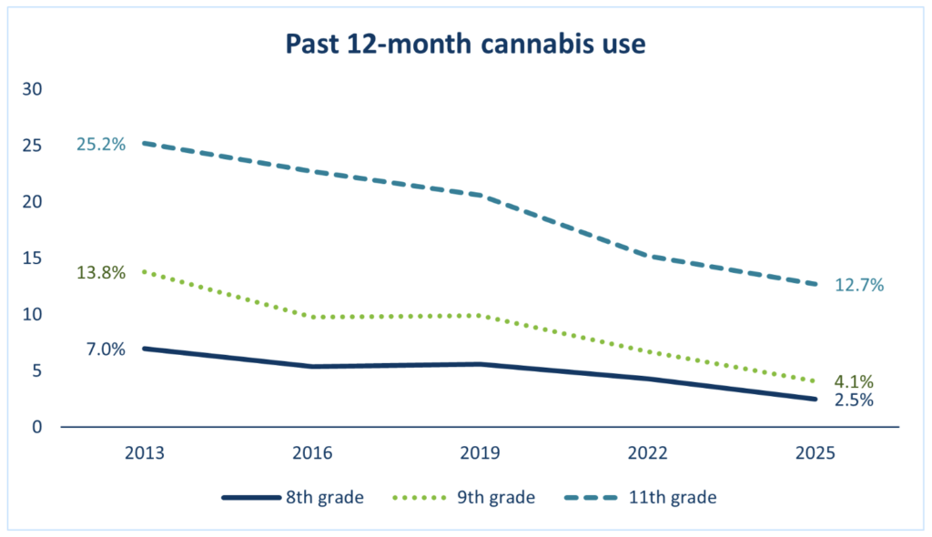 There has been a 57.7 percent statewide drop in self-reported past-year cannabis use from 2013 to 2025 among 8th, 9th and 11th graders combined. There has also been a decline over time in past-month use.
