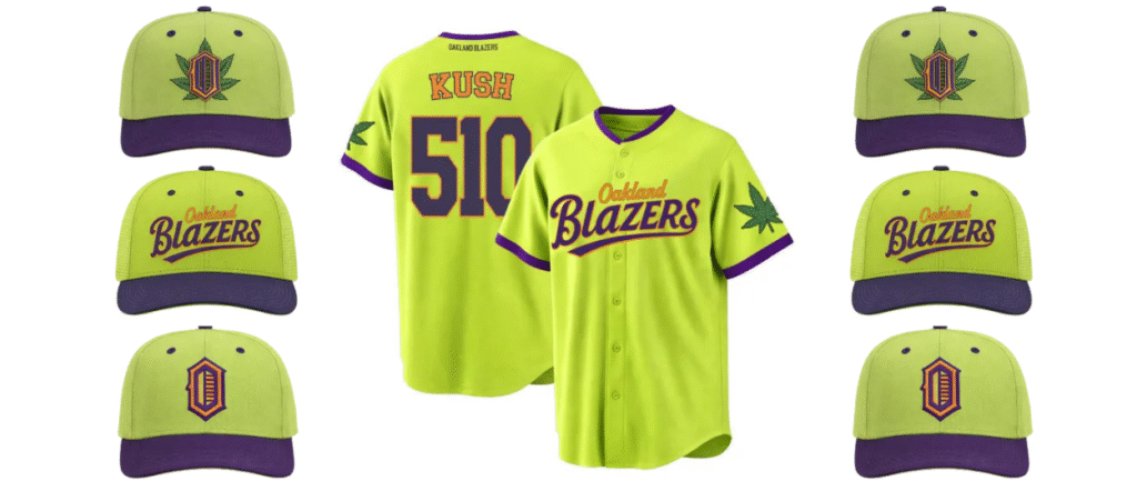 Call it a tale of two holidays: The Oakland Blazers, a cannabis-themed alt-identity of the Pioneer League champion Oakland Ballers that was announced 19 days ago as an April Fools’ Day joke has rounded the bases into full-blown reality on 4/20, with the team’s announcement via Instagram that it is now taking pre-orders for fan merchandise that includes two styles of ball cap, a trucker hat and a jersey with “Oakland Blazers” across the front, a pot leaf on the left shoulder and the number 510 (a nod to the East Bay area code that includes Oakland) on the back.